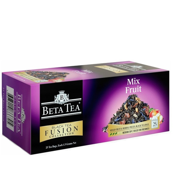 Черный пакетированый чай Фьюжн "Фруктовый микс" из коллекции Beta Tea Fusion - это купаж цейлонского и кенийского мелколистового чая с добавление плодов яблока и лимона. В составе Бета Фьюжн: чай черный мелколистовой, кусочки яблока и лимона, листья шиповника, натуральные ароматизаторы малины и клубники.