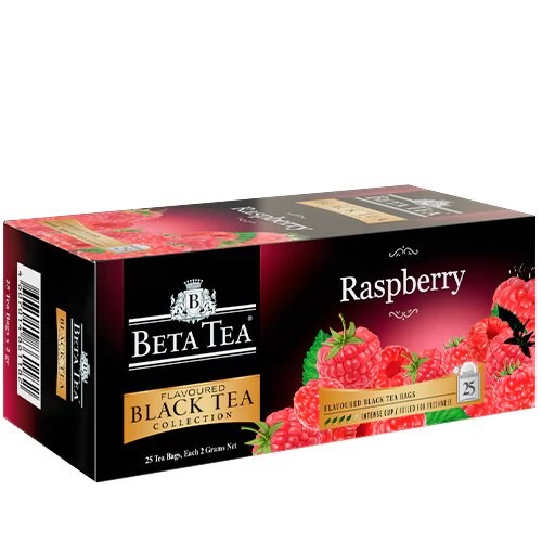 Малина - это природный антибиотик. Бета Чай с малиной является жаропонижающим противовоспалительным воздействие на организм, устраняет сухость во рту при простудных заболеваниях и придает силы ослабленному организму. Черный чай с малиной восполняет запас полезных веществ при авитаминозе.