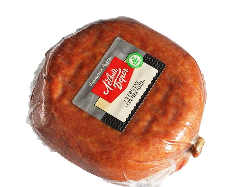 Сервелат Греческий имеет тонкий пряный аромат специй и копчения. Мелкий шпик на срезе создаёт красивый рисунок и пикантный вкус.