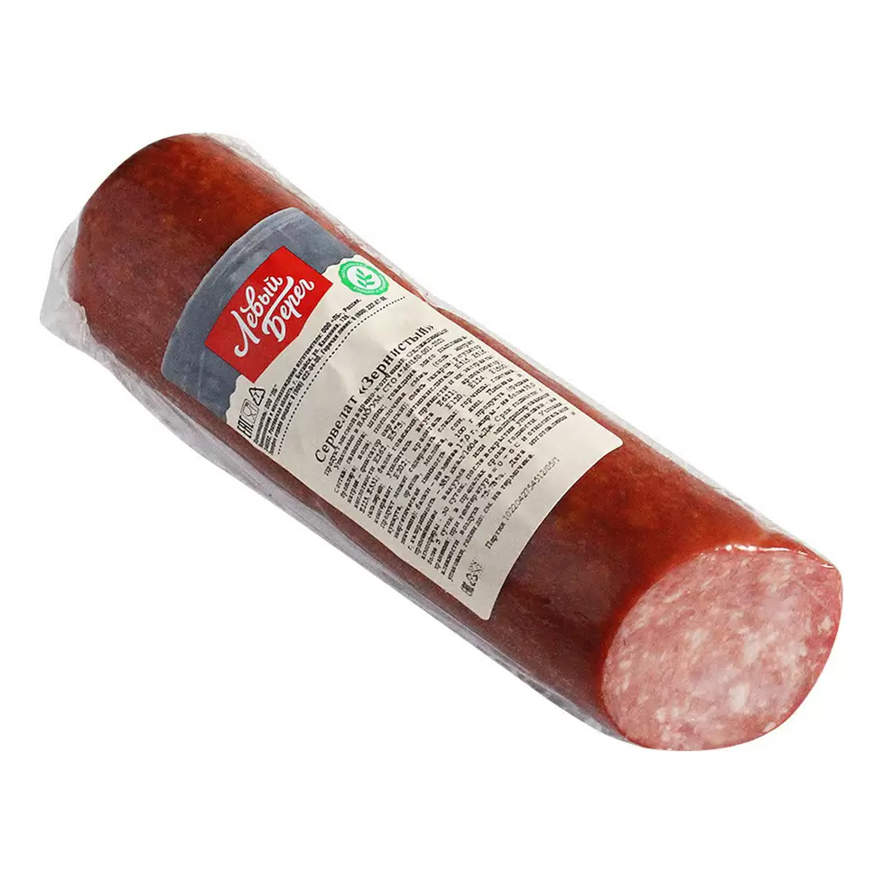 Сервелат "Зернистый" сырокопчёный "Левый Берег" - это вид колбасы, который отличается своей крупнозернистой костянкой. Внешне зернистый сервелат имеет темно-коричневый цвет, гладкую поверхность и несколько грубую текстуру. Внутри колбасы располагается сыровяленое мясо с крупными белыми зернами, которые являются кусочками свиной мякоти. Зернистый сервелат отличается насыщенным мясным вкусом, которому придает особенную пикантность и ароматность специальный состав приправ.