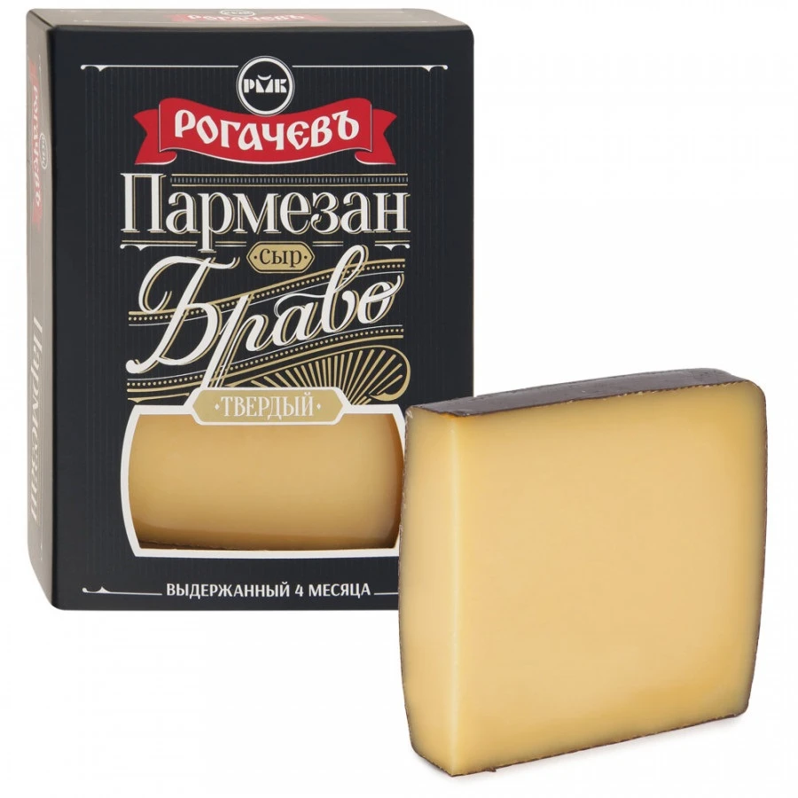 Сыр твердый "Пармезан BRAVO" 45% "Рогачев" имеет плотную текстуру и светло-желтый цвет со множеством кремовых вкраплений. Продукт с ярким пряным ароматом, сложным и насыщенным вкусом обладает терпким островатым послевкусием. Сыр этого сорта отличается низким содержанием холестерина, поэтому подойдет людям, которые следят за фигурой или придерживаются в питании принципов ЗОЖ.